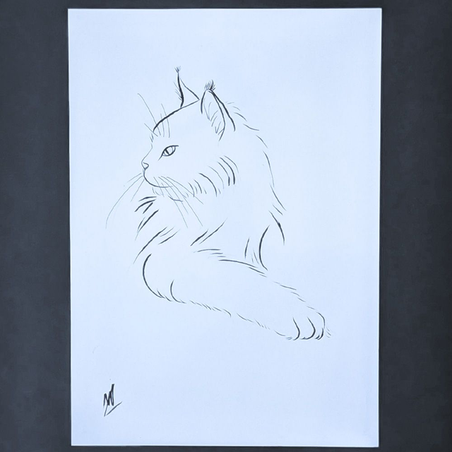 Portrait de chat Maine Coon à l'encre de chine. Format A4.